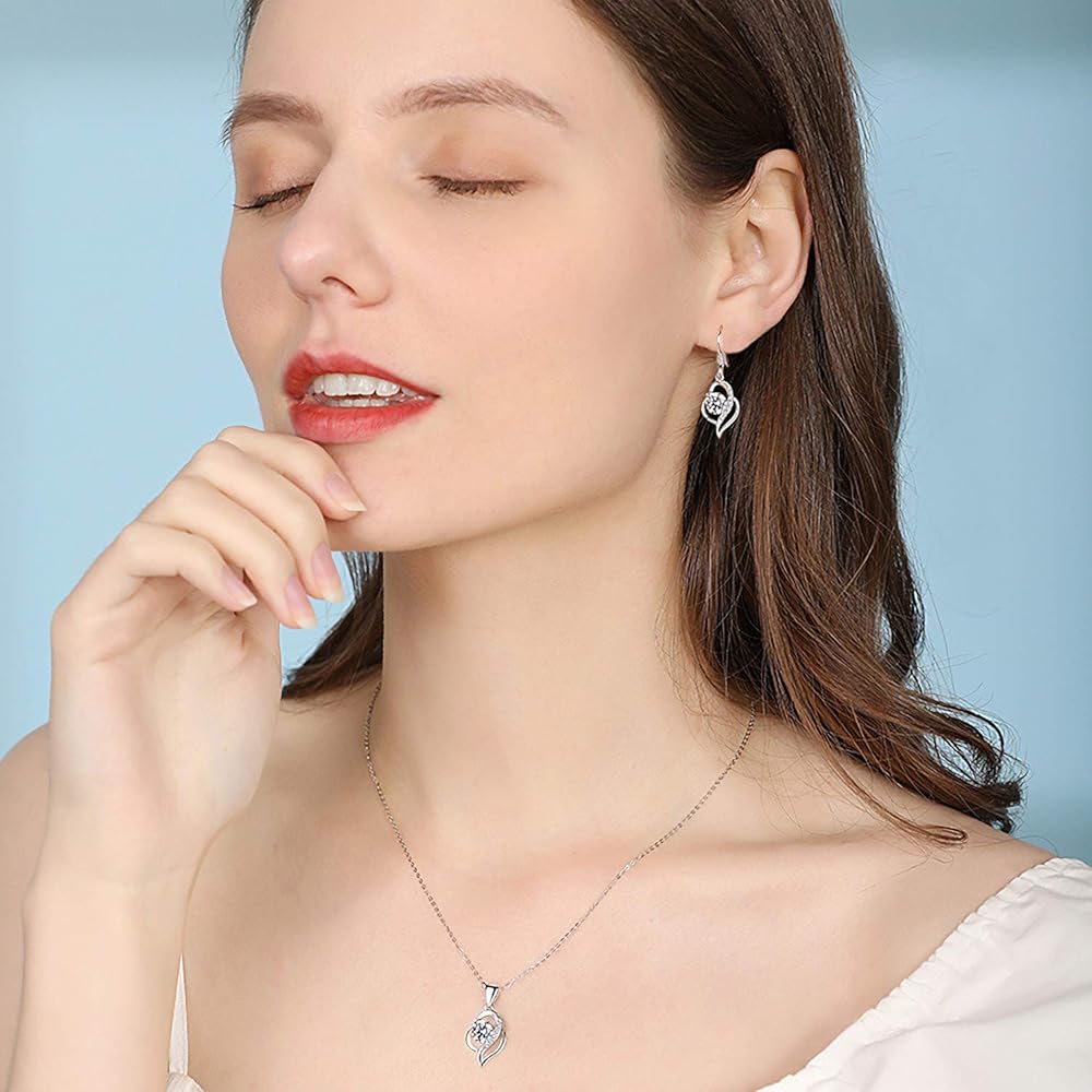 Elegant Flowing 925 Sterling Silver Heart Necklace Pendant + Earrings with White Stone Jewellery